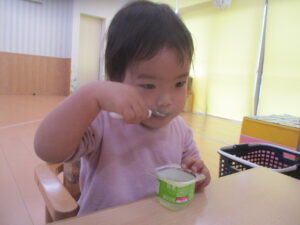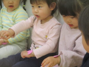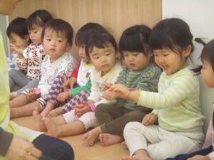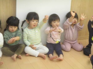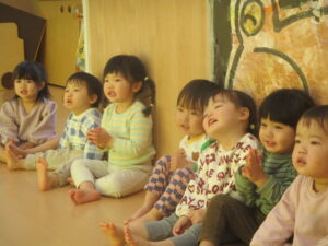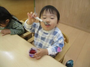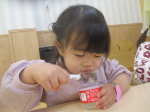 お別れ会を行いました。歌をうたったり出しものを見たり、楽しい時間でした。おやつはゼリーを美味しくいただきました。楽しい1年間でした。ありがとうございました。