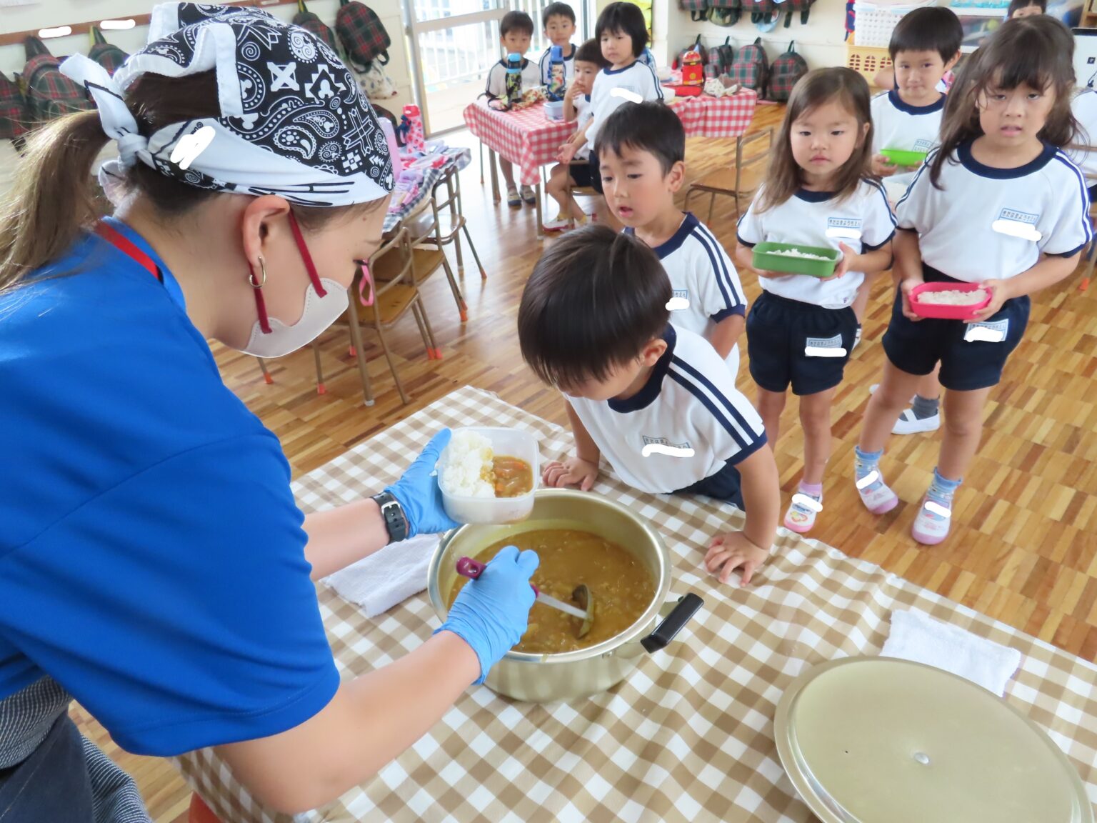 5月31日(水)に北浜幼稚園の「カレーの日」が開催されました。子供たちが園の畑で収穫した野菜や御家庭から提供していただいた野菜を年長組さんはドキドキしながら切りました。全園児スプーンがとまらず、おかわりをいっぱいして美味しくいただきました!!PTA役員の皆様、御協力いただきありがとうございました。