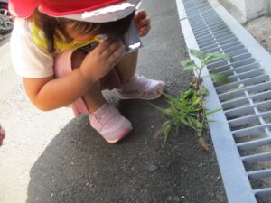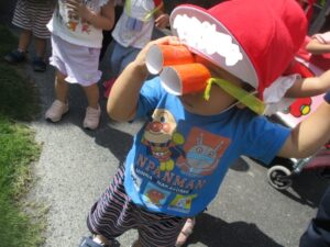 今日はお散歩へ。クレヨンで模様を描いた“メガネ”、そこから見える世界に子供達、歓声を上げていました。お花や草、野菜も見つけました。