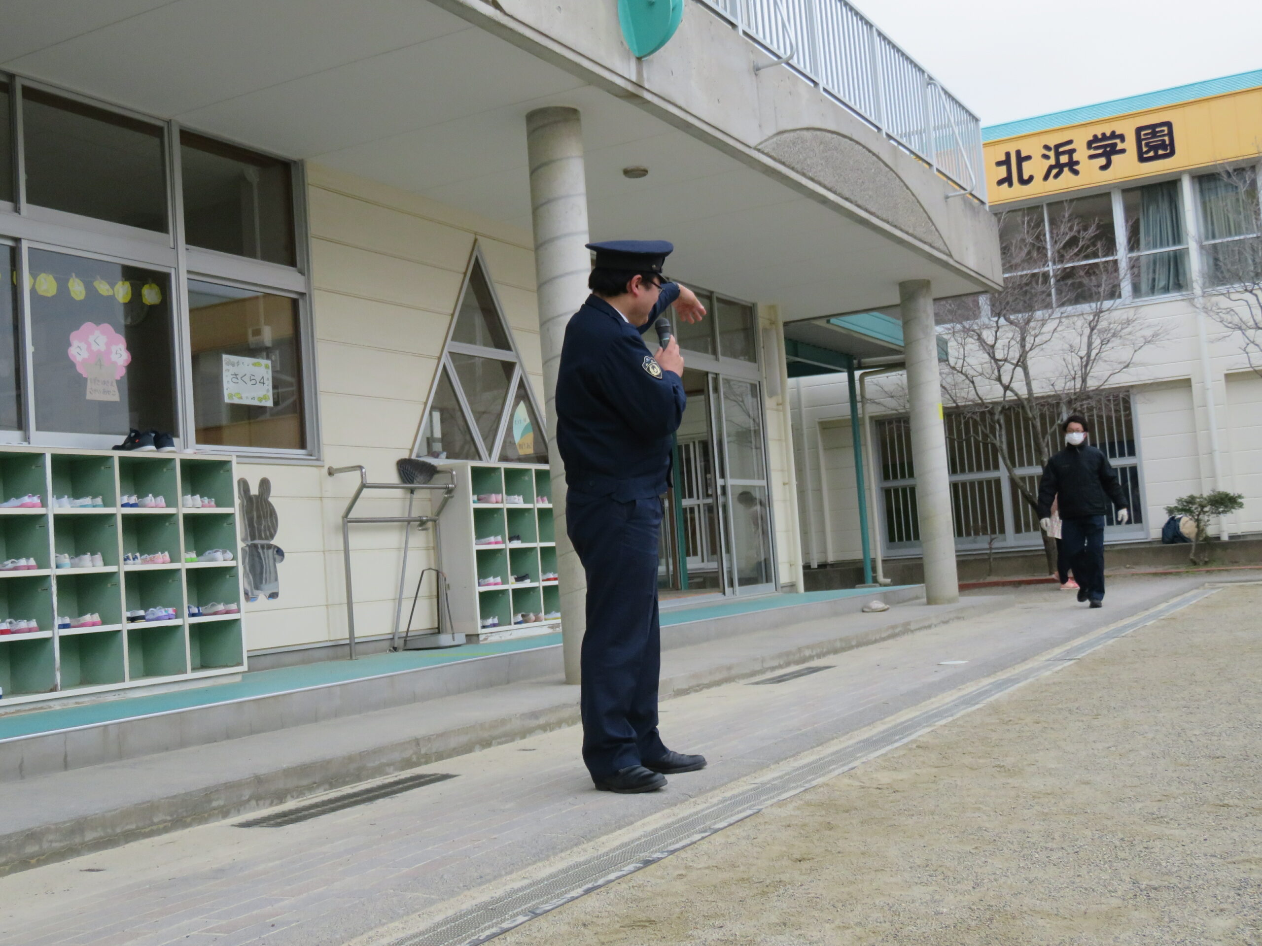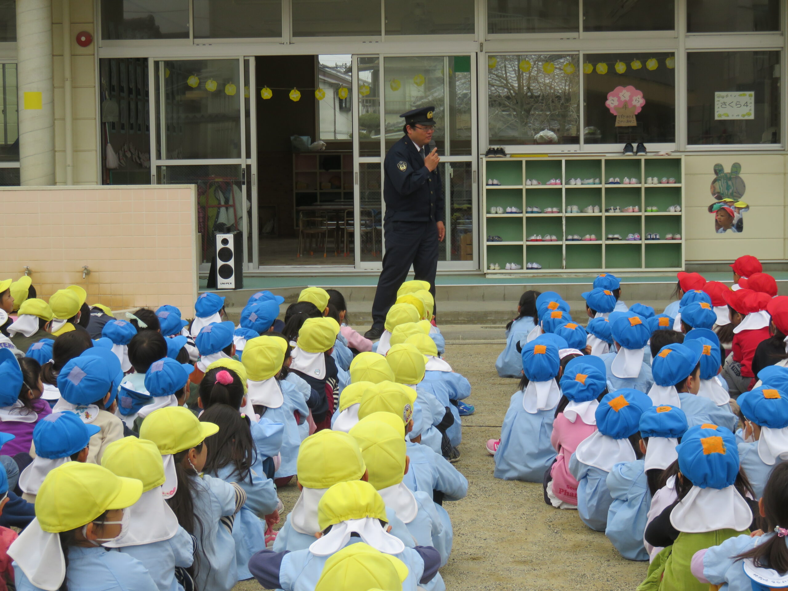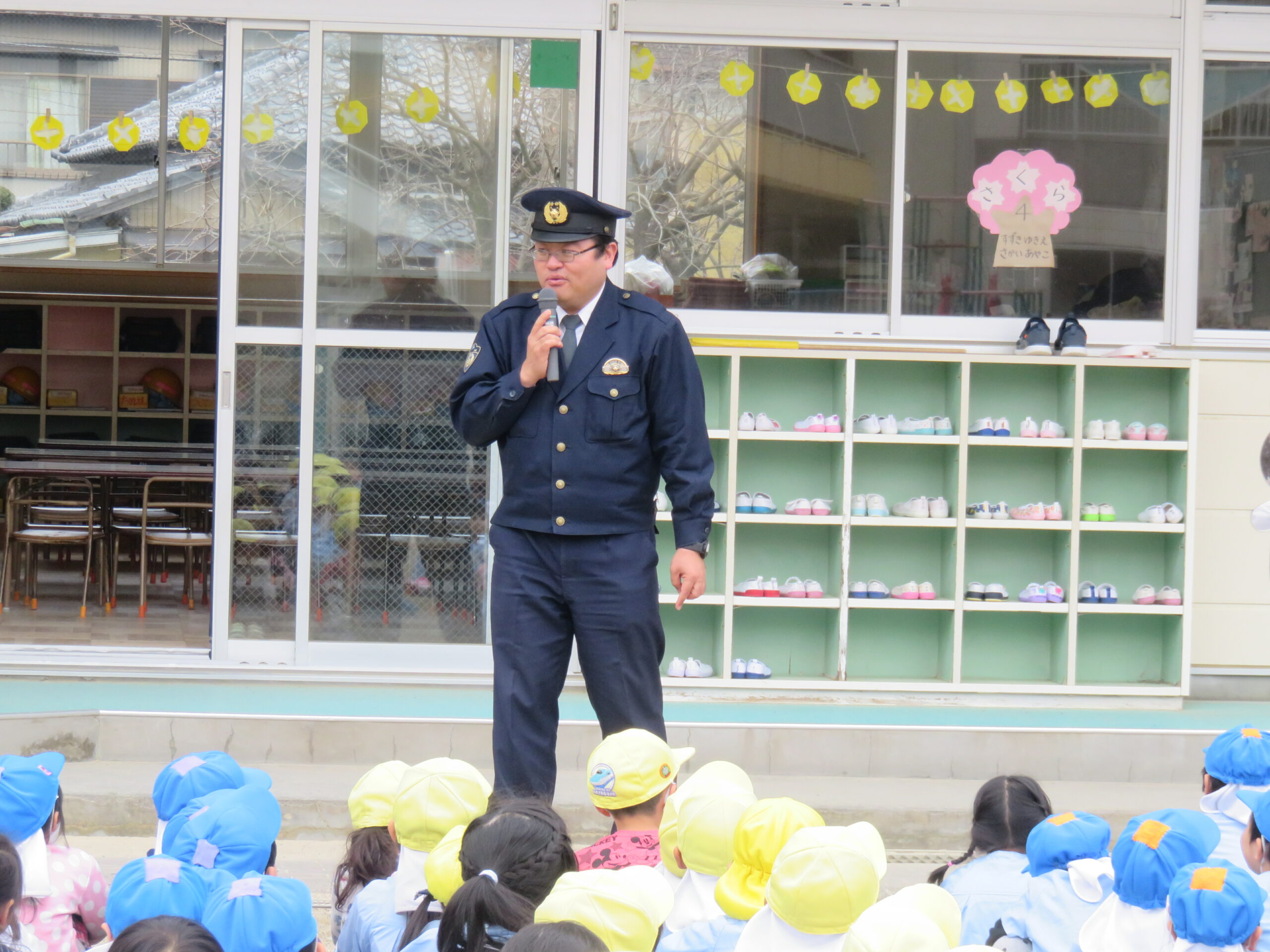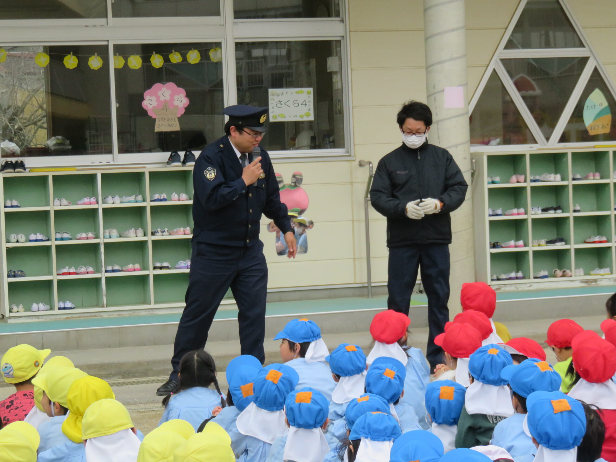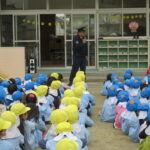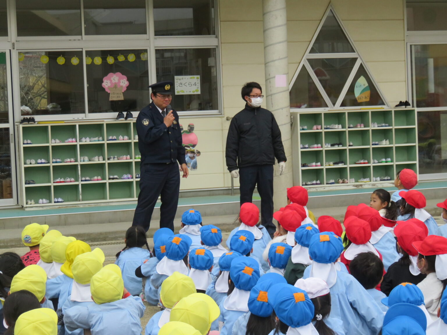 令和2年2月25日(火)浜北警察署による不審者対応訓練が行われました。警察署の方が不審者役となり、実際に園庭を歩きまわり、職員が対応する訓練をしました。子どもたちは不審者を発見するとすぐに一階のお部屋に逃げ込み、安全になるまで静かに待つことが出来ました。最後は警察署の方からまとめのお話を聞き、改めて”いかのおすし”を学ぶことが出来ました。