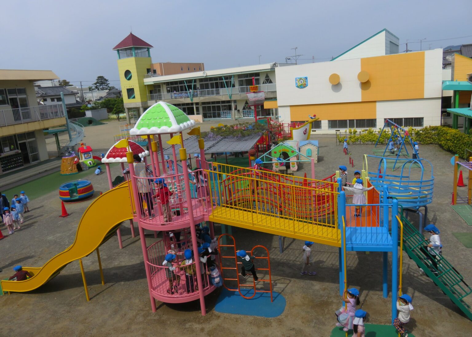 今年度から素敵な新しい遊具として既存の総合遊具に黄色の大きな滑り台等が出来ました。新しい遊具に目を輝かせていた子供たち、約束事を守りながら楽しんで遊んでいます。