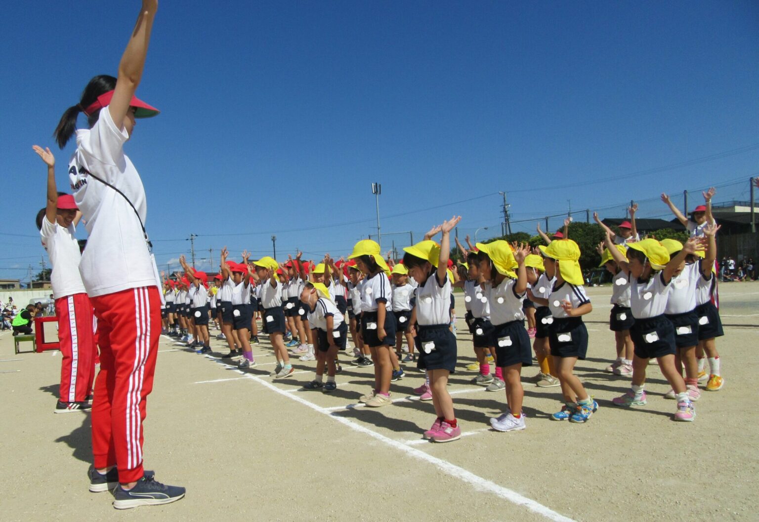R5年10月7日(土)に伎倍小学校にて運動会が開催されました。『輝け! ちびっこチャンピオン!』をスローガンに掲げ、オープニングセレモニーでは『ズバババーン』の曲に合わせて楽しく掛け声をしながら踊りました。続いて、各学年かけっこを行いました。ゴールを目指して一生懸命走りきる子供たち! 親子競技では、年中組は玉入れをしたり、年長組はボール運びリレーを行いお家の方と一緒に楽しむことができました。年少組は、親子でお揃いのアイテムを身に付け『ツバメ』の曲に合わせて可愛く踊ることが出来ました。年中組は、ボンボンを手に持ち『Poppin´Hoppin´Lovin’』の曲に合わせて担任やお友達と元気いっぱい踊りました。幼稚園最後の運動会となる年長組はみんなで力をあわせて組体操を行いました。難しい技にも挑戦し、かっこいい姿を見せてくれました!一人ひとりが自分の力を出し切り、一生懸命頑張りました。
