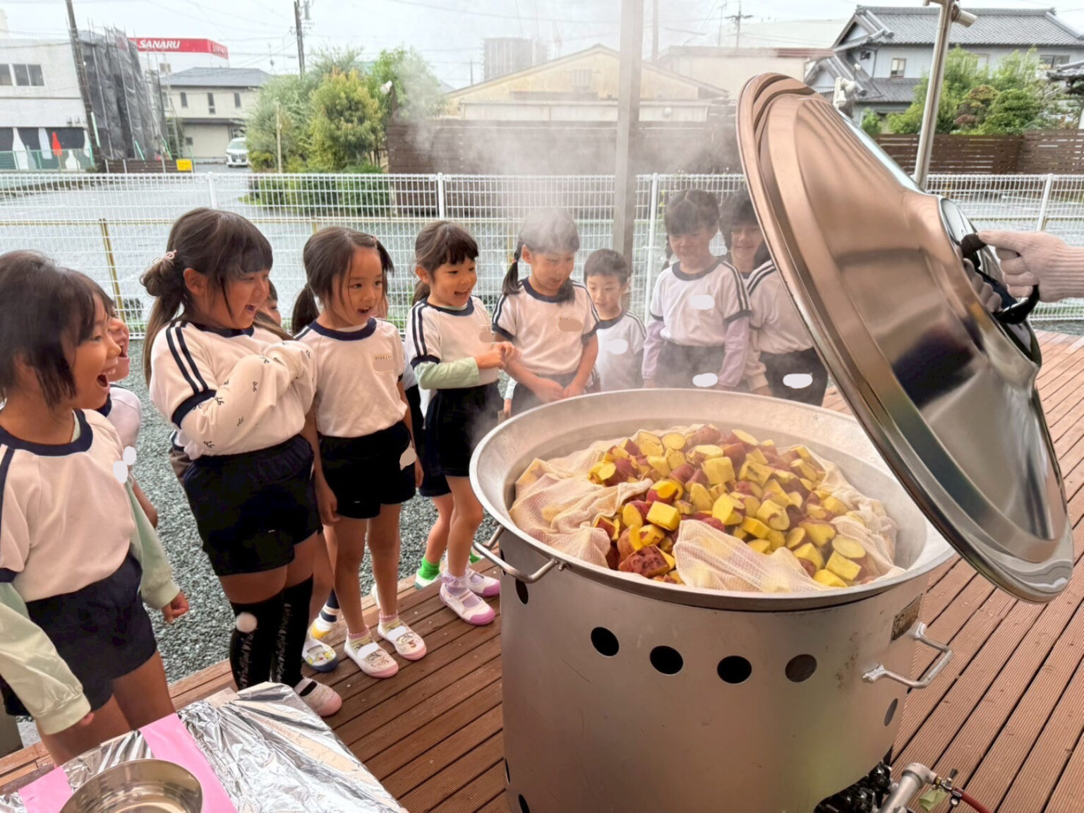 そしていよいよ収穫祭!!年長組さんが収穫したさつまいもをPTA役員さんとエネジン(株)の方々が大きなお鍋で蒸かしてくださいました。