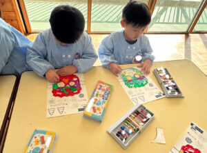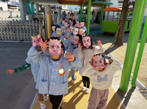 クラスでは自分で作ったお面をつけて豆まきごっこをしたり、園内を散歩して節分を楽しみました。