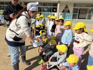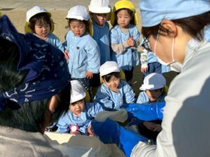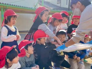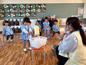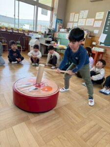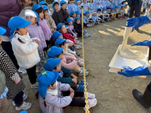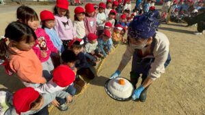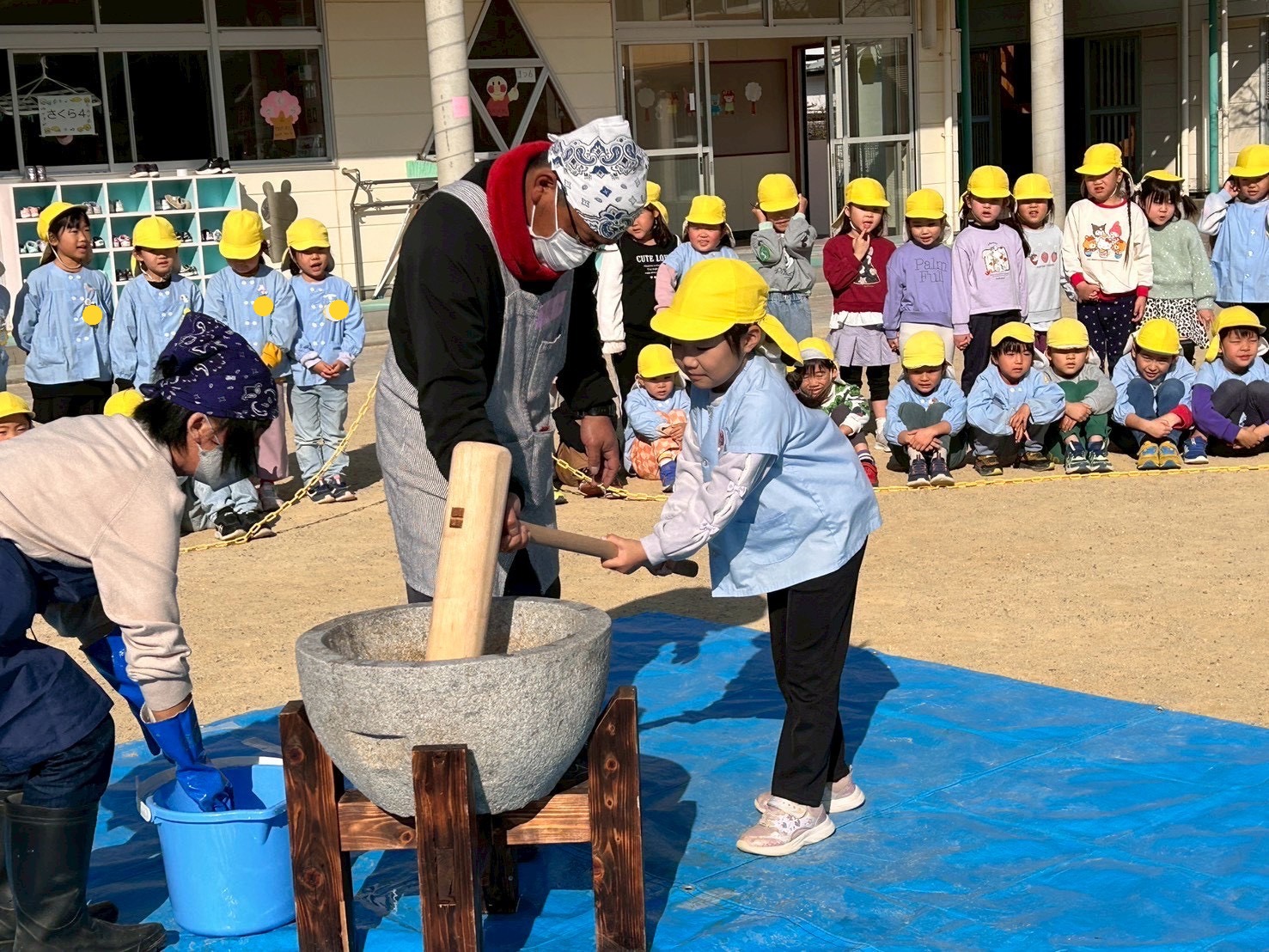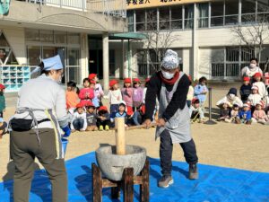 学年ごとに園庭に集まり、力強く杵を振り下ろす姿を見て「よいしょ~!」や「がんばれ~😆」と応援しました!