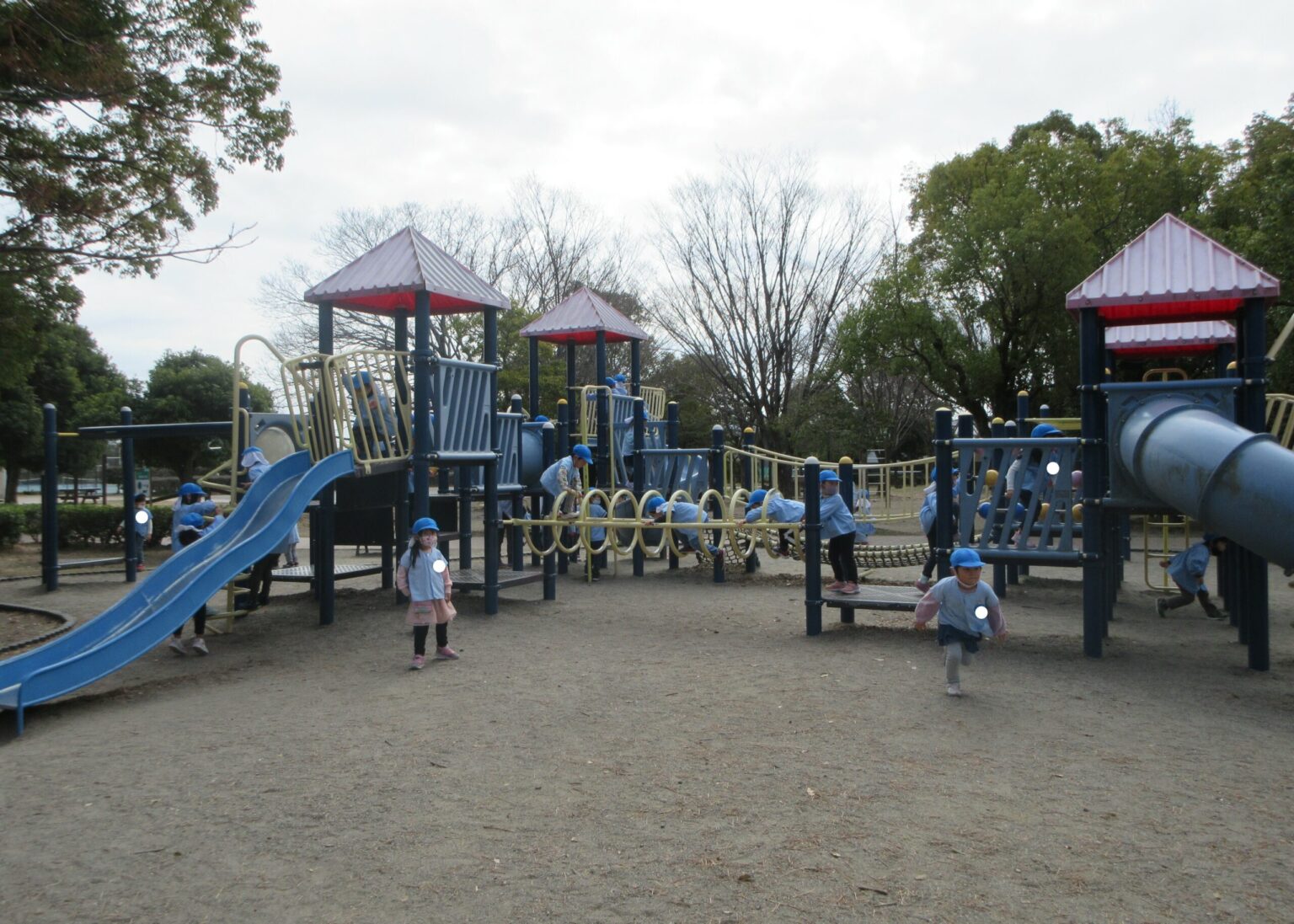 R3年2月22日、3月1日に年少組と年長組が美薗中央公園に出掛けました。桃の花を見て春を感じたり、たくさんの遊具で遊んだりしました。給食の後にはお待ちかねのお菓子を食べ、子供たちはとても嬉しそうでした。クラスの友達や先生と楽しい思い出作りが出来て大満足な一日となりました。