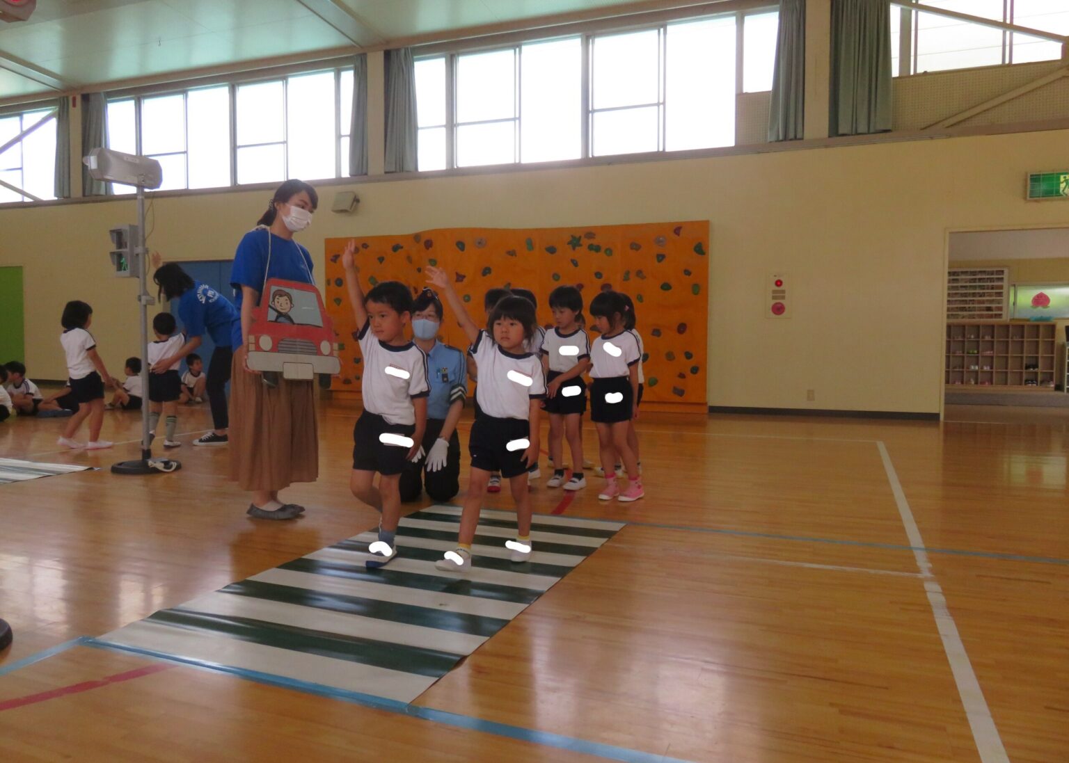 R2年6月9日(火)に松組対象の交通安全教室が行われました。体育館で交通安全指導員さんから道路の歩き方・横断歩道の渡り方などのお話を聞き、その後実際に歩く練習をしました。車が来ていないか、信号が青になっているか確認をして渡ることができました。お家でもお子様と交通ルールを守って歩くように心がけましょう。
