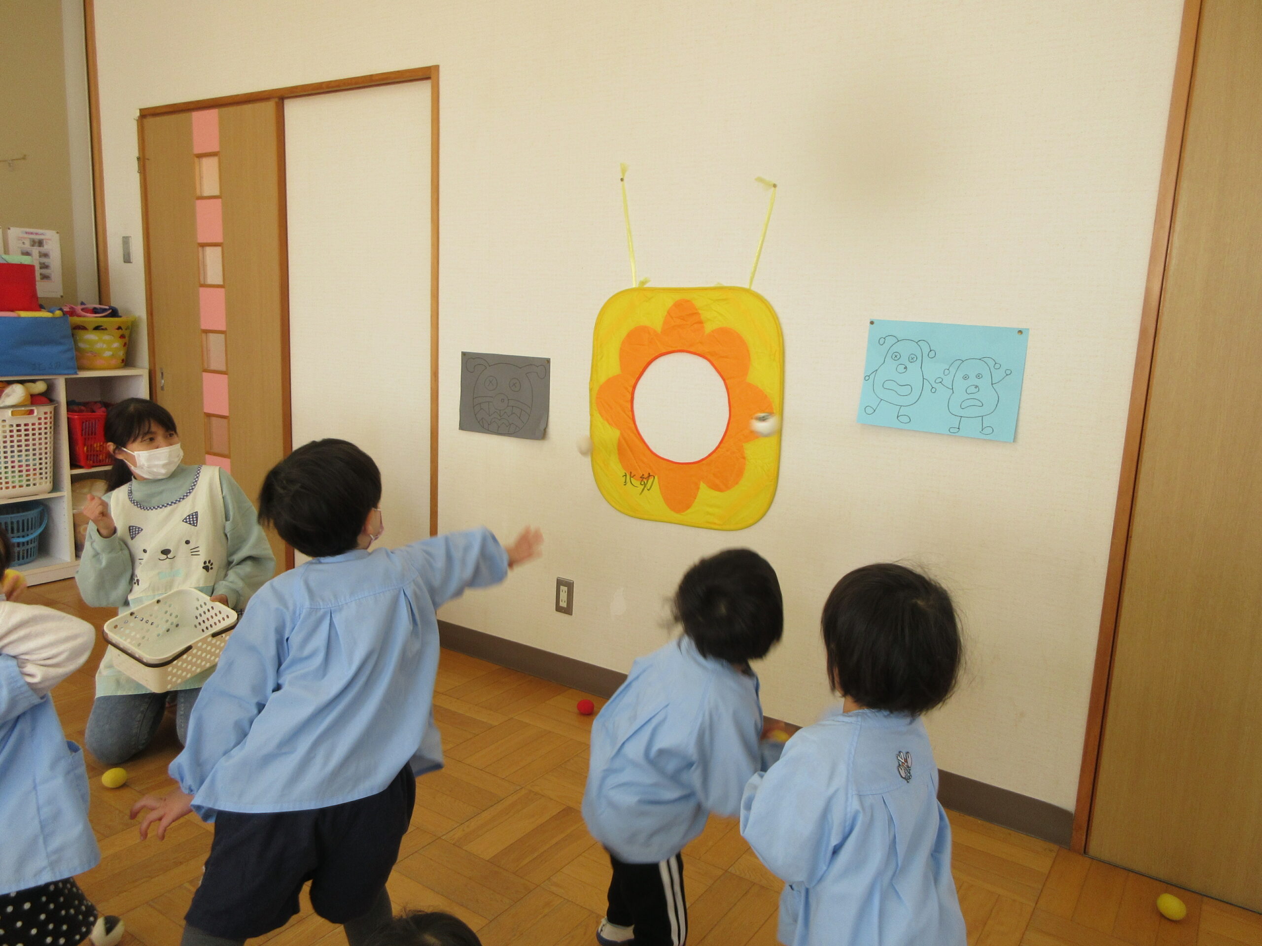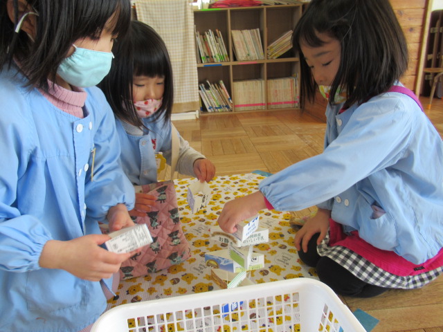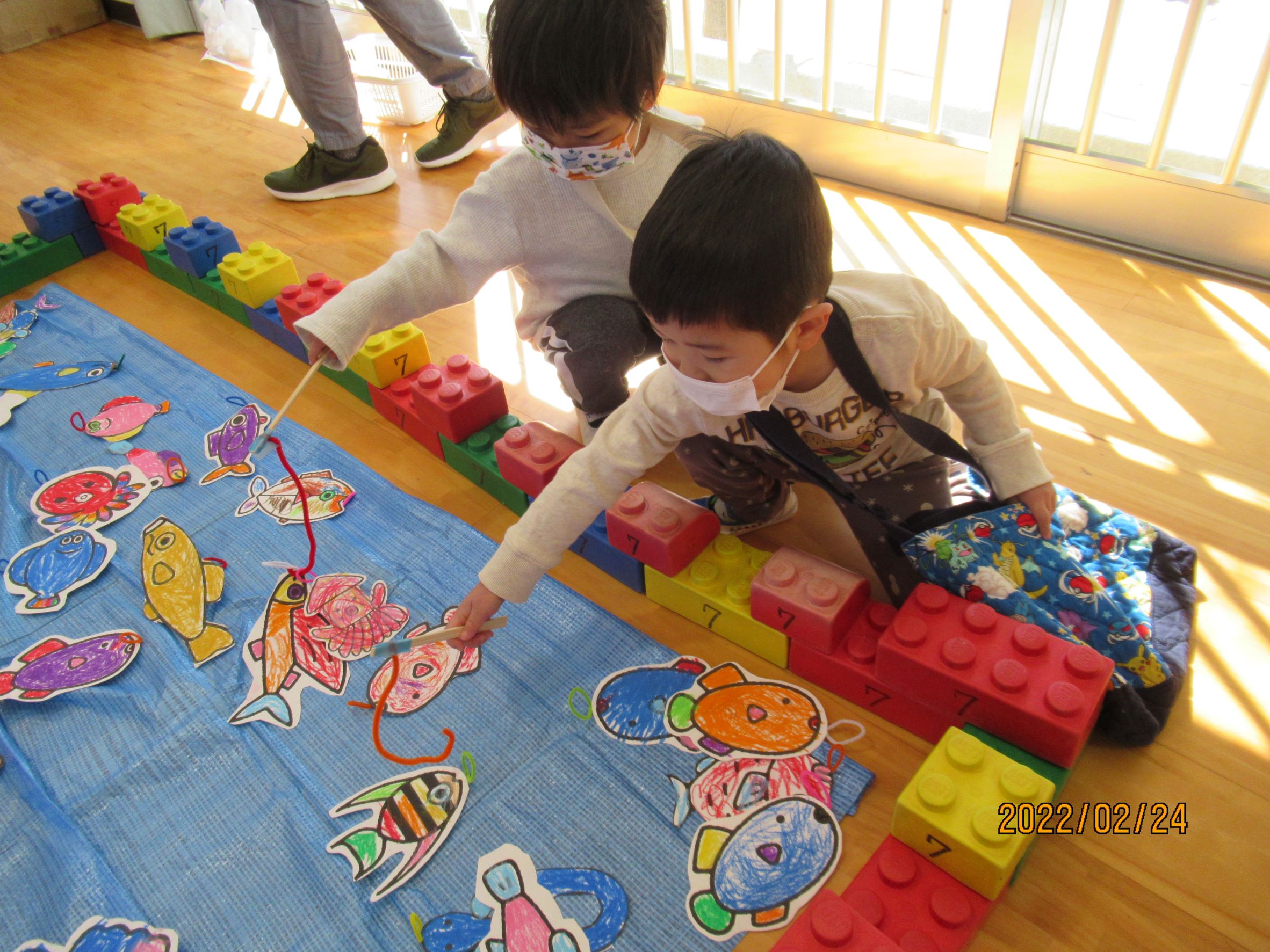 R4年2月24日(木)に園遊会が行われました。今年度は、コロナウイルス感染症対策として園児のみで開催された園遊会。各たてわりのお部屋の中には魚釣り・的当て・牛乳パックの積み上げゲーム・時計作りがあり、どれも楽しんでいました!又、段ボールで作られた迷路をしたり、新幹線のぞみに乗ったりし嬉しそうな子供たちの声が聞こえてきました♪