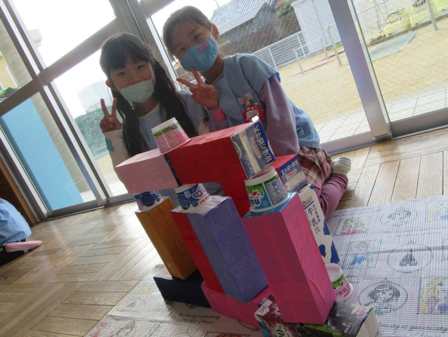 R3年1月20日(水)に園遊会が行われました。今年度はコロナウイルス感染症対策として、園児のみで開催された園遊会。お部屋の中には段ボールで作られた迷路や、的当てが登場し、嬉しそうな子どもたちの声が聞こえてきました!牛乳パックの積み上げゲーム、色塗り、腕輪作りも楽しみました♪
