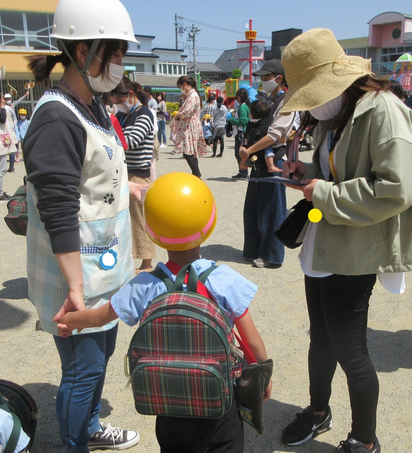 R3年4月20日(火)21日(水)に引き渡し訓練が行われました。年少組は保護者の方と一緒にサイレンの音を聞き、年中組・年長組は担任と一緒に避難訓練を行った後で園庭に並び、保護者の方が迎えに来てくれました。帰り道は、保護者の方と手を繋ぎ、危険な場所が無いか確認しながら徒歩で降園しました。