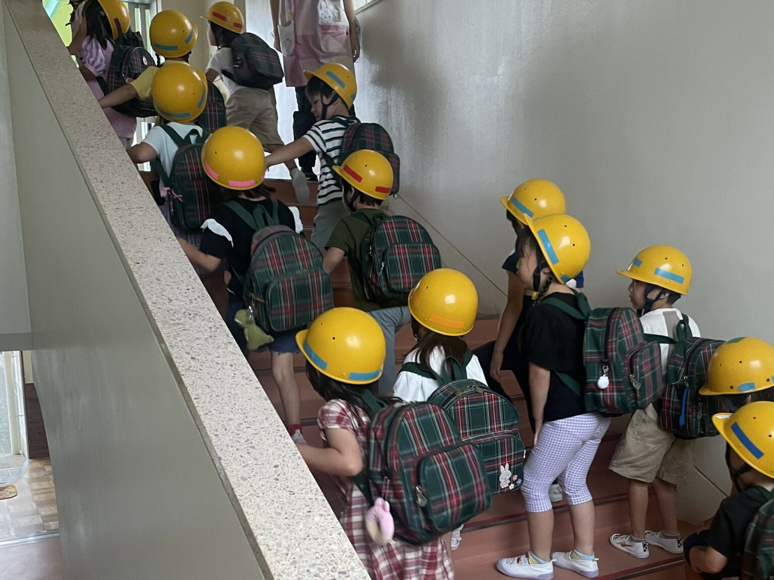 令和6年7月1日(月)に台風や洪水などで水害が起きた場合を想定した水害訓練が行われました。放送をよく聞いて避難の為に荷物をまとめたり、1階のクラスは2階のクラスに移動したりと真剣な表情で水害訓練に取り組む姿が見られました🌟様々な状況を想定し、日々訓練をしています!