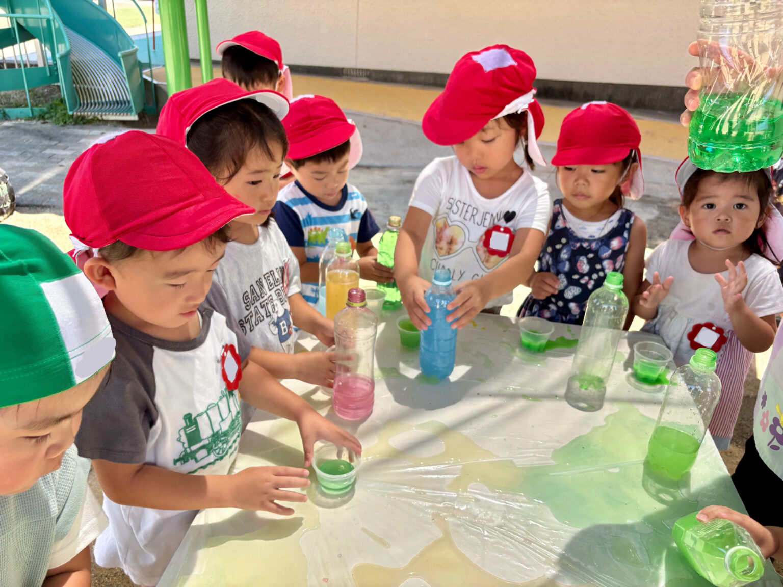 令和6年7月22日(月)に年少組さんが、色水遊びを行いました❕様々な色を混ぜて色の変化を楽しみました🎵「色が変わった!」と驚きとワクワクの表情を見せてくれる子供達。「次は何色にしようかな~❔」とお友達と会話しながら遊ぶ姿が見られました😊💕 年長、年中組さんも夏ならではの色水遊びや、しゃぼん玉、泥遊びを楽しんでいます🌟
