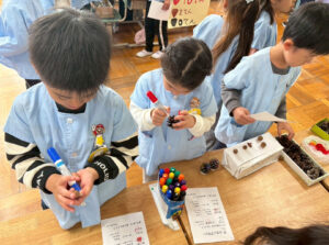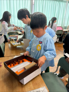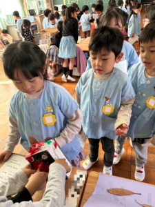 北浜小学校1年生お兄さんお姉さんが準備した「秋のおもちゃまつり」に参加し、交流会を楽しみました。どんぐりを使ったマラカスや迷路、松ぼっくりを使ったけん玉など、様々な種類のおもちゃがあり、楽しく遊ばせていただきました!🍁