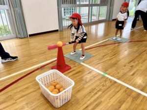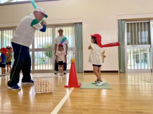 1回目は、ボールを使ったゲーム遊びやボールの投げ方を教えていただき、2回目はキャッチボールとバットを使って打つ活動をしました。初めて行う活動もあり、歓声を上げ大喜びで参加していた子供達でした☆