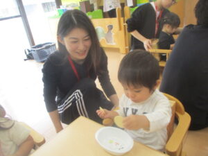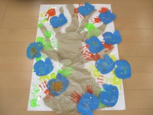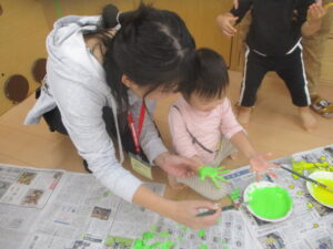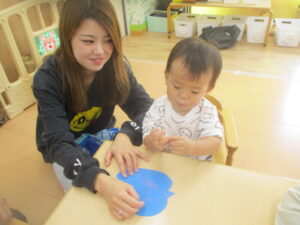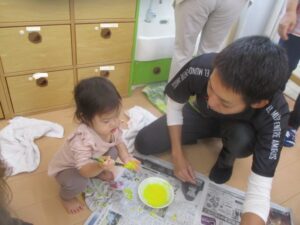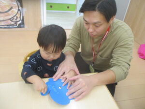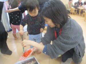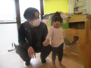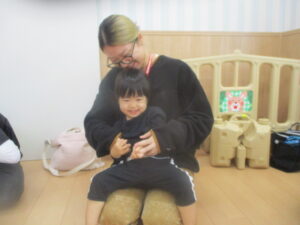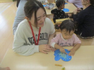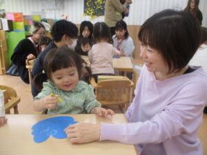 保護者の方が来てくれて一緒に過ごしました。普段の様子を見ていただき、体操やふれあい遊び、製作を行いました。着脱や手洗い等、自分でできることが増えてきて、保護者のみなさんも感心した様子でした。楽しい時間になりました。