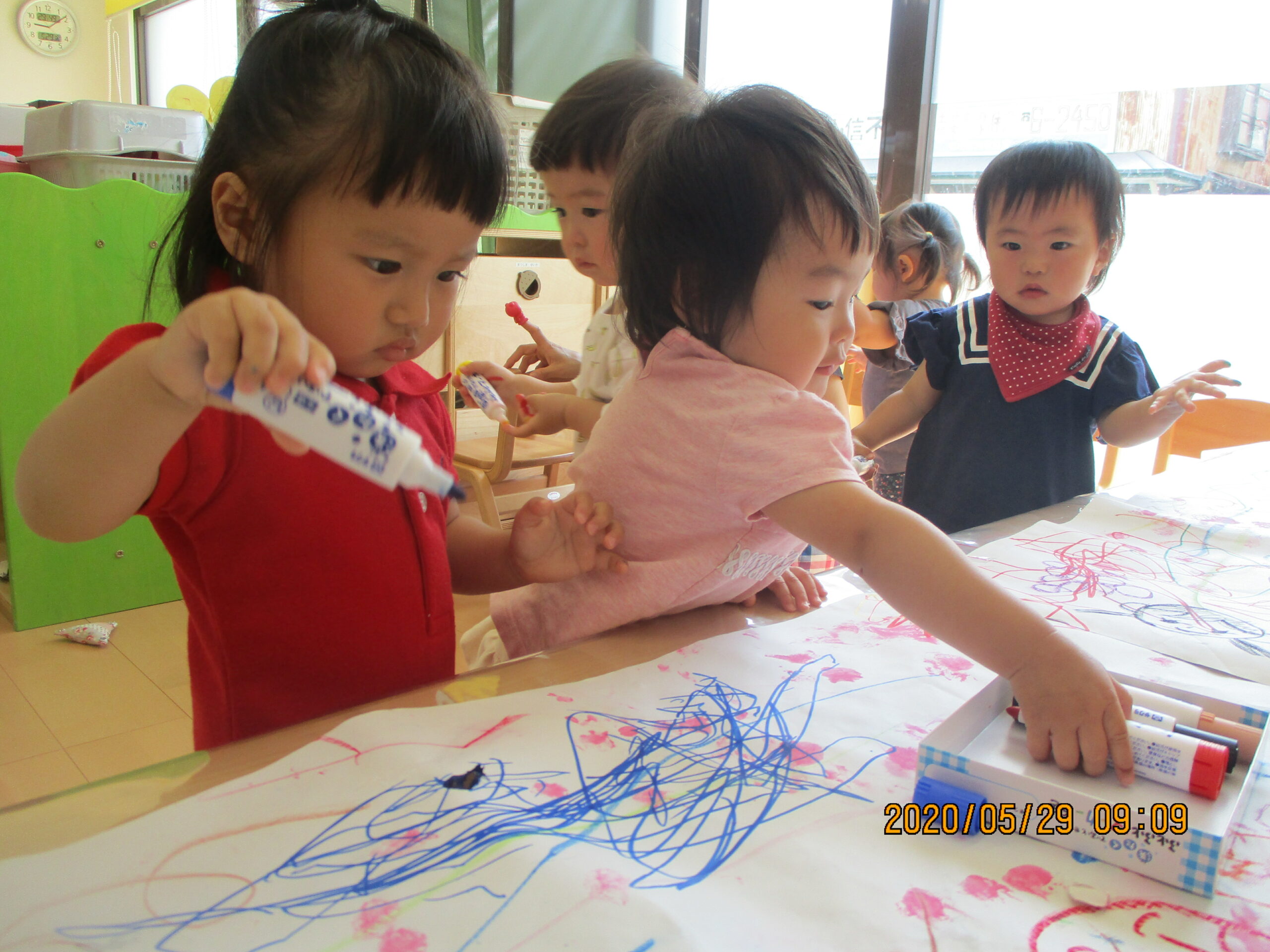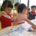 大きな紙にシールをはり、スタンプ遊び、水性ペンでなぐり描きを楽しみました。ペンでスーっとかける感触に夢中でした。