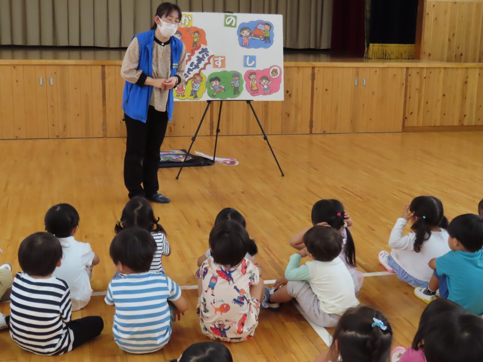 R5年度6月6日(火)に浜北警察署の方が幼稚園に来てくださり、知らない人に声を掛けられたらどうすればいいのか?というお話をききました。防犯の合言葉「いかのおすし」(いか=しらないひとについていかない、の=しらないひとのくるまにのらない、お=おおごえをだす、す=すぐにげる、し=しらせる)を教えてもらいました。御家庭でも防犯について話し合ってみましょう!!