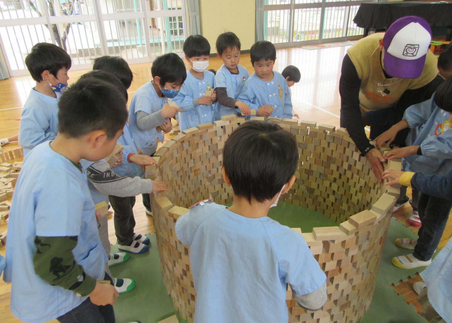 R2年2月14日(金)に『つみきのそのさん』による積み木のイベントが行われました。クラスのみんなと協力して、子どもたちの背丈ほどのドームを作っていきました。完成し出入り口を作った後は中に入ることもできましたよ。ドームを崩した時には大歓声が聞こえてきました。その後は、三角の積み木が8個繋がっている『はっこさん』を使い桃太郎のお話を見て楽しみました。