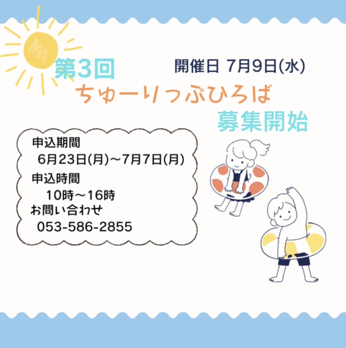 持ち物:水筒、帽子、タオル(体を拭く・汗拭き用)、水着・プール用オムツ(プールに入りたい方はお持ちください)