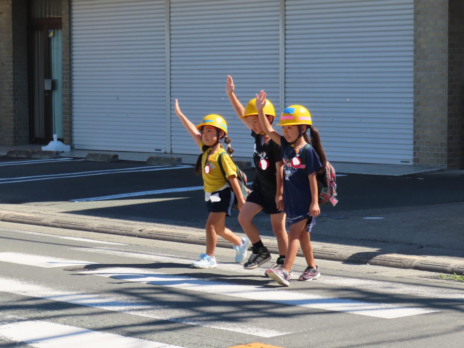 R5年9月26日(火)に年長児対象の交通安全教室が行われました。体育館で交通指導員さんから道路の歩き方やお約束を聞いた後、4人1組となり実際に道を歩く練習を行いました。道路には交通安全指導員さんやPTA役員の方々が、子供たちの安全を確認し見守ってくださいました。御家庭でも交通安全についてお話してみてください。