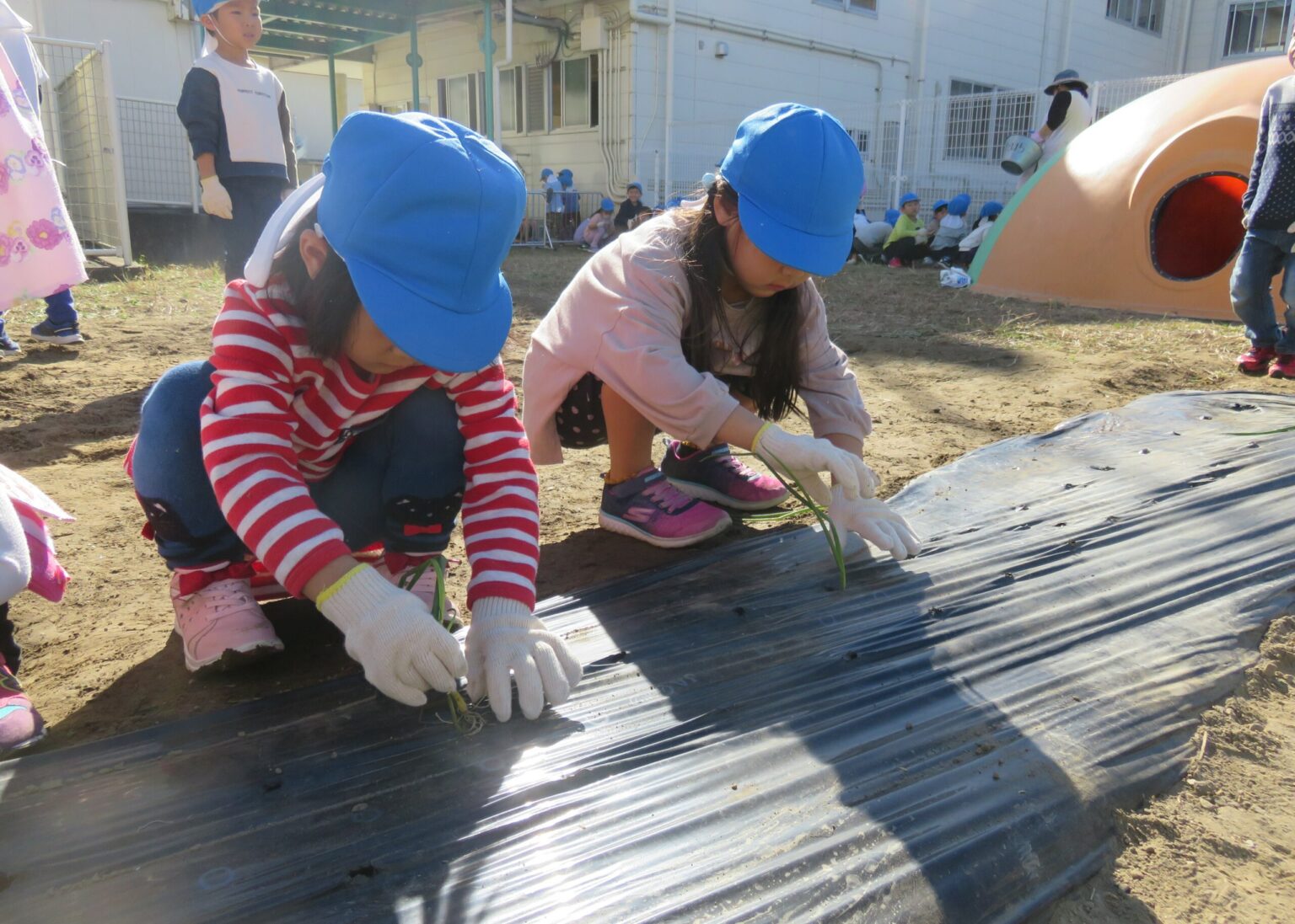 令和2年11月24日に年中組がたまねぎの苗植えを行いました。苗を土の穴に入れ、上から優しく土をかけました。植えた後には「大きくなあれ」とおまじないをしていました。収穫するのが楽しみです!
