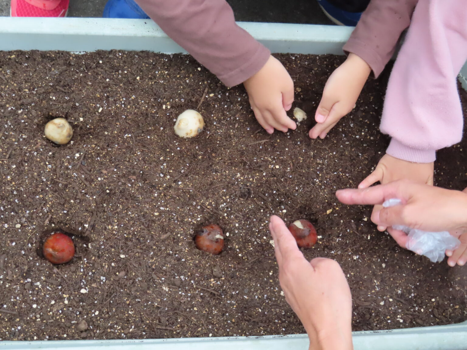 R4年11月1日に年中さんがチューリップの球根植えを行いました。来年の春、綺麗な花が咲くように水をあげ、みんなで「大きくなあれ!」とおまじないをしました♪ 何色のチューリップが咲くのか楽しみですね!